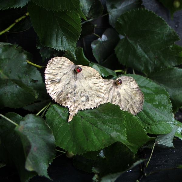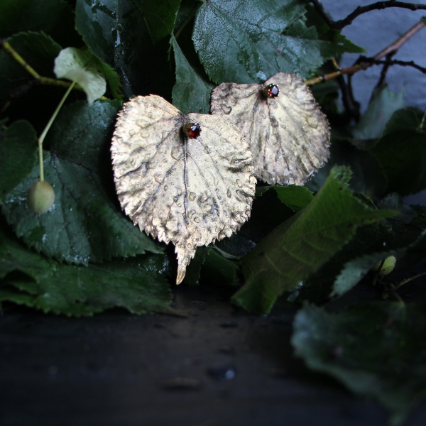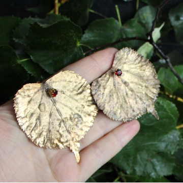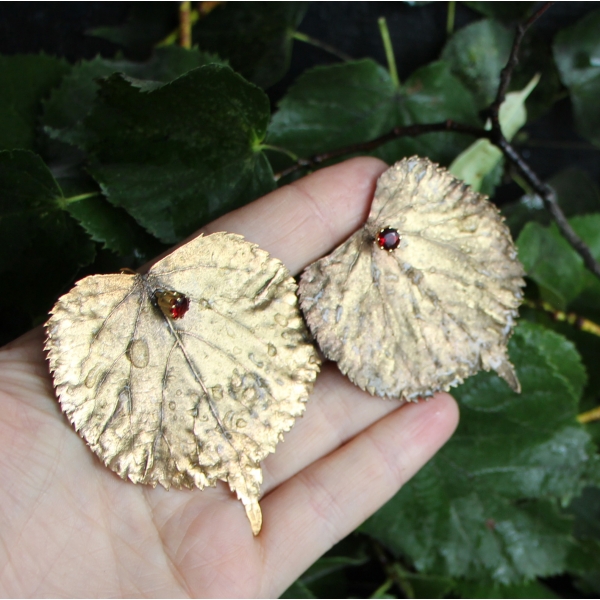 Lipové listy ve zlatém kabátku s jiskřičkami granátů - něžný, optimistický a vskutku originální šperk pro vnímavou a přátelskou duši, která oceňuje krásu detailů a dokáže pohlédnout pod povrch zdánlivě obyčejného.