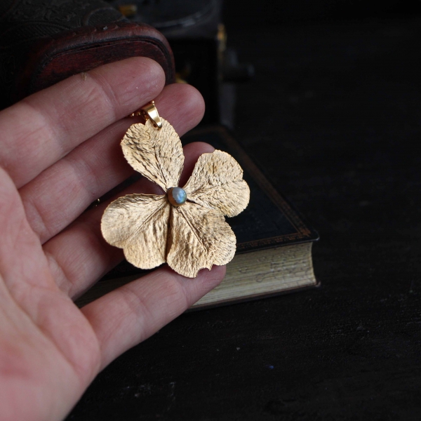Skutečný čtyřlístek, nalezený na rozkvetlé louce zalité sluncem, se díky tenoučkému zlatému hávu stal jedinečným královským šperkem s nádechem nadpozemské krásy.