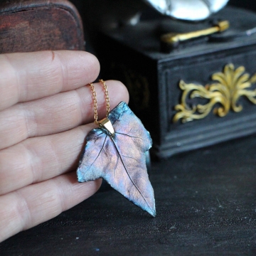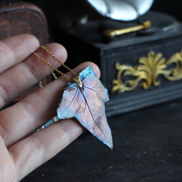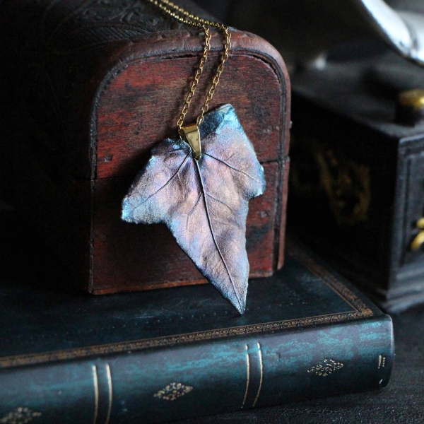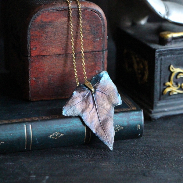 Materiál: list břečťanu, měď, postříbřené, patina, lak, řetízek z pozlacené oceli