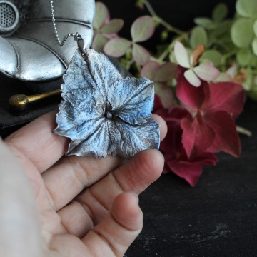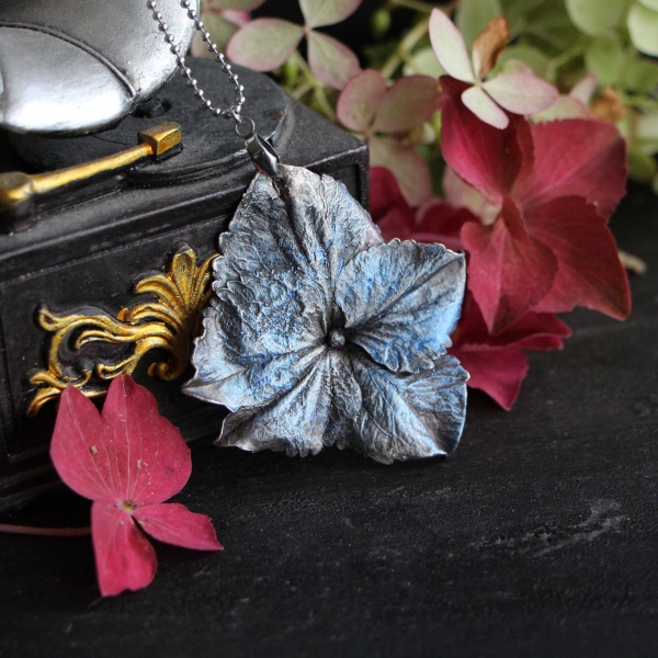 Materiál: květ hortenzie, měď, postříbřené, patina, antioxidační prostředek, řetízek chirurgická ocel
