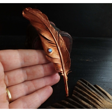 Jemné pírko oděné do lehkého a přitom pevného kabátku mědi vypadá jako peříčko kouzelného zlatého ptáka z pohádek. Kapka měsíčního kamene připomíná rosu lesknoucí se v jasném světle Luny. Tento přívěsek bude nejlépe slušet ženě - víle, usměvavé, laskavé a trochu tajemné. Jen díky peří mohou ptáci svobodně létat - vzneste se i vy, užívejte si život s nadhledem a splňte si svoje sny.